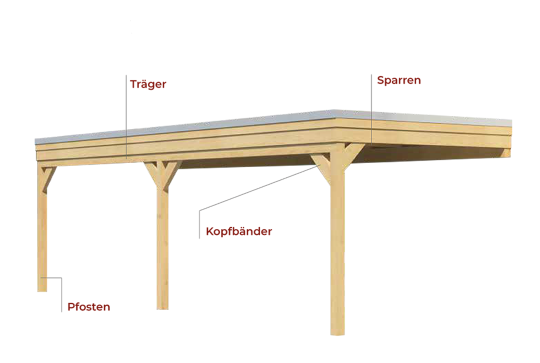 Onze verlijmde houten carports worden individueel gepland en in stabiele doorsneden geleverd. Er wordt een compleet houten bouwpakket inclusief bevestigingsmateriaal meegeleverd. De bijpassende dakbedekking en andere optionele accessoires zijn verkrijgbaar. U kunt kiezen tussen carports met plat- en zadeldak voor wandmontage of vrijstaand.