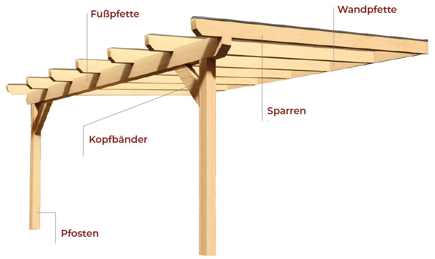 Unsere Holz-Überdachungen bestehen aus Wand- und Fußpfette, Sparren, Pfosten und je nach Modell aus zusätzlichen hinteren Pfosten, Querstreben und Kopfbändern. Hier am Beispiel "Wandanbau":