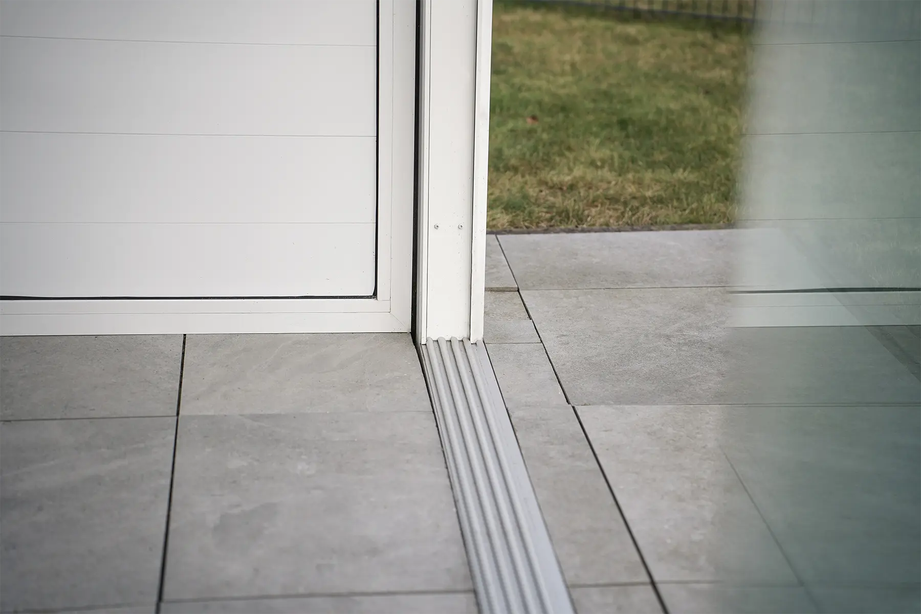 Glasschiebewände von steda verfügen über flache, abgerundete Bodenschienen (auch Rail genannt) für einen fast barrierefreien Durchgang. Im Lieferumfang sind außerdem ein Ober-Rail, Bürstendichtungen, Laufrollen und passende Handgriffe enthalten.