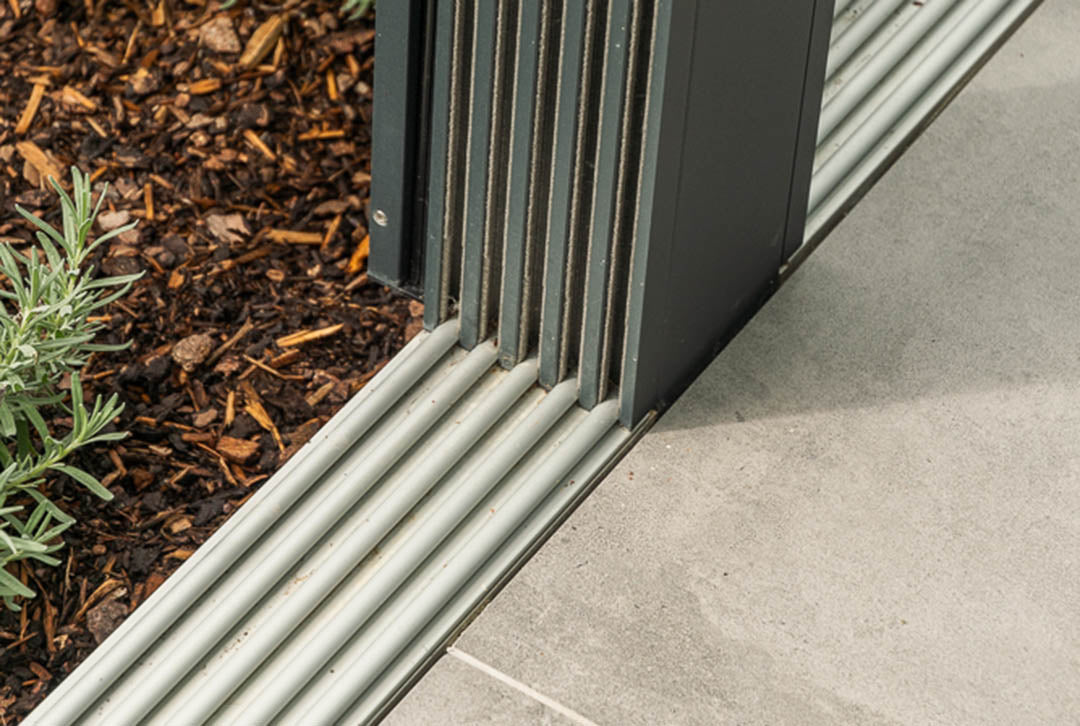 Glasschiebewände von steda verfügen über flache, abgerundete Bodenschienen (auch Rail genannt) für einen fast barrierefreien Durchgang. Im Lieferumfang sind außerdem ein Ober-Rail, Laufrollen und passende Handgriffe enthalten.