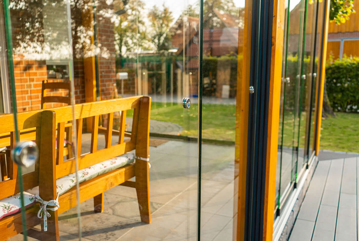 Glasschiebewände machen aus einem luftigen Sommer-Freisitz einen geschützten Sitzplatz für die kühleren Herbst- oder Frühlingstage, einen sogenannten „Kaltwintergarten“ mit einfachverglasten Schiebeelementen.