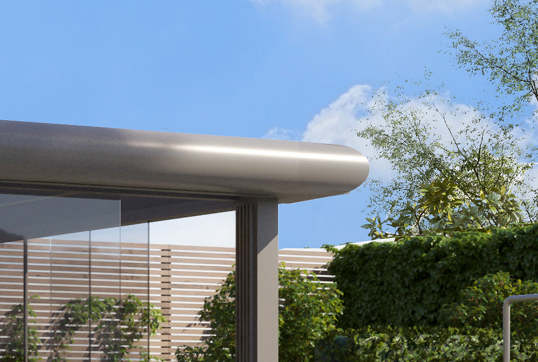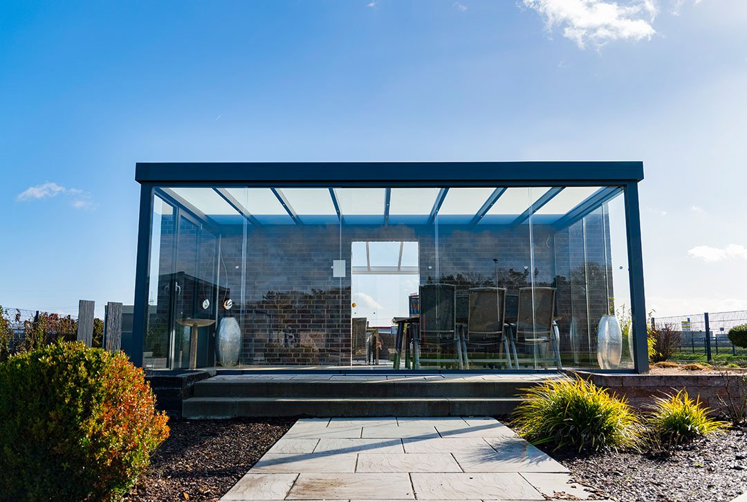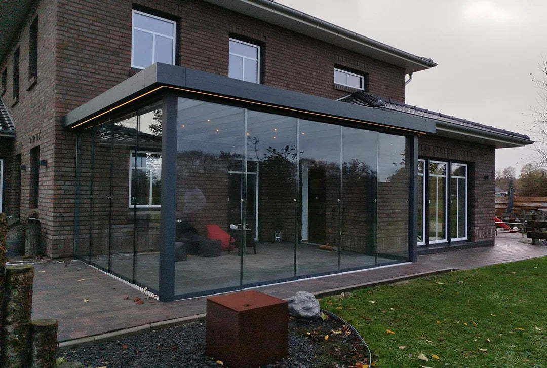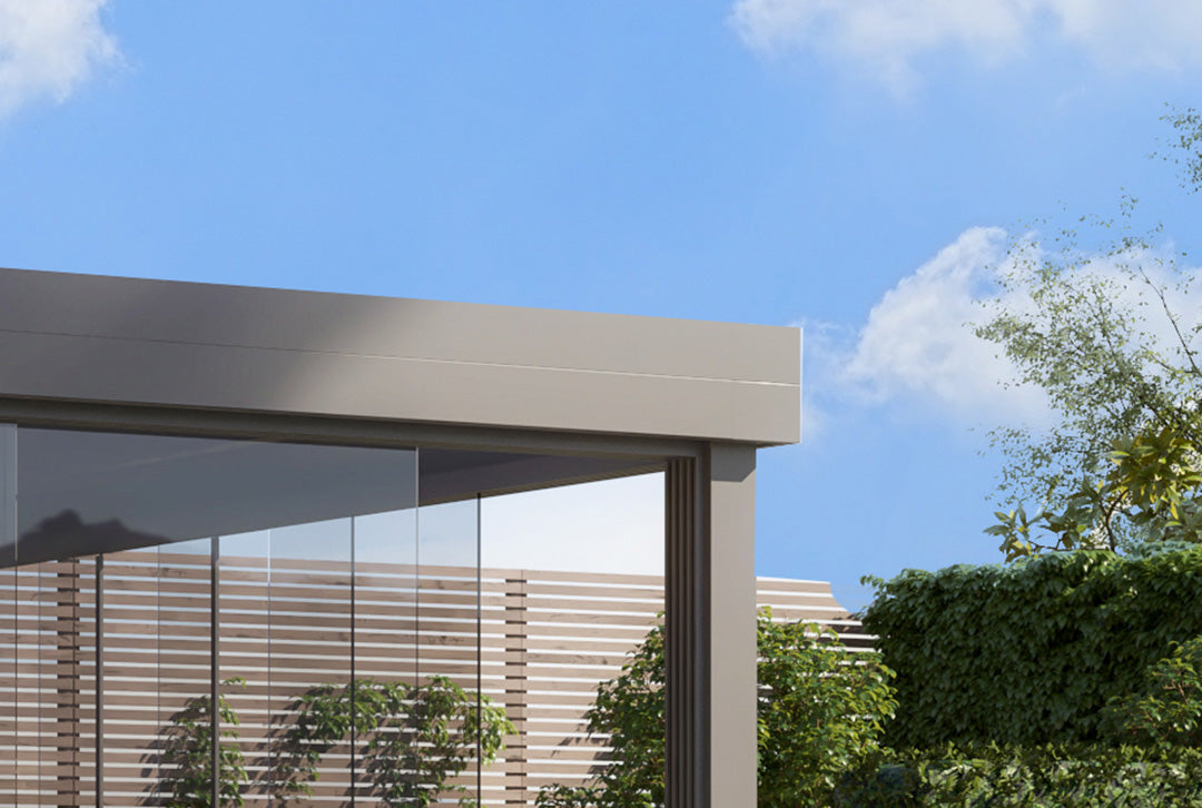 Du kannst eine Flatroof-Überdachung jederzeit mit Glasschiebewänden nachrüsten.