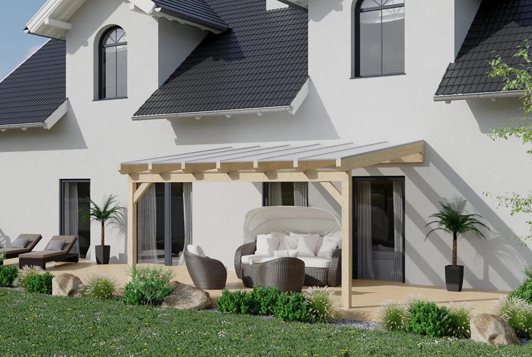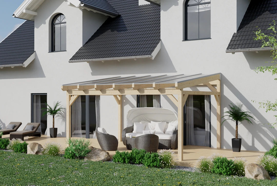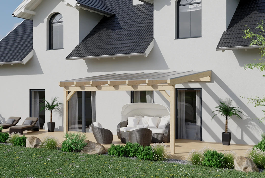 Hergestellt aus robustem Holz, das für seine Langlebigkeit bekannt ist, und in einem stilvollen eiche hell gehalten, ist diese Überdachung eine attraktive und praktische Lösung für deine Terrasse. Ob für gemütliche Abende im Freien oder als geschützter Bereich für Pflanzen und Möbel – diese Terrassenüberdachung erfüllt alle Anforderungen.