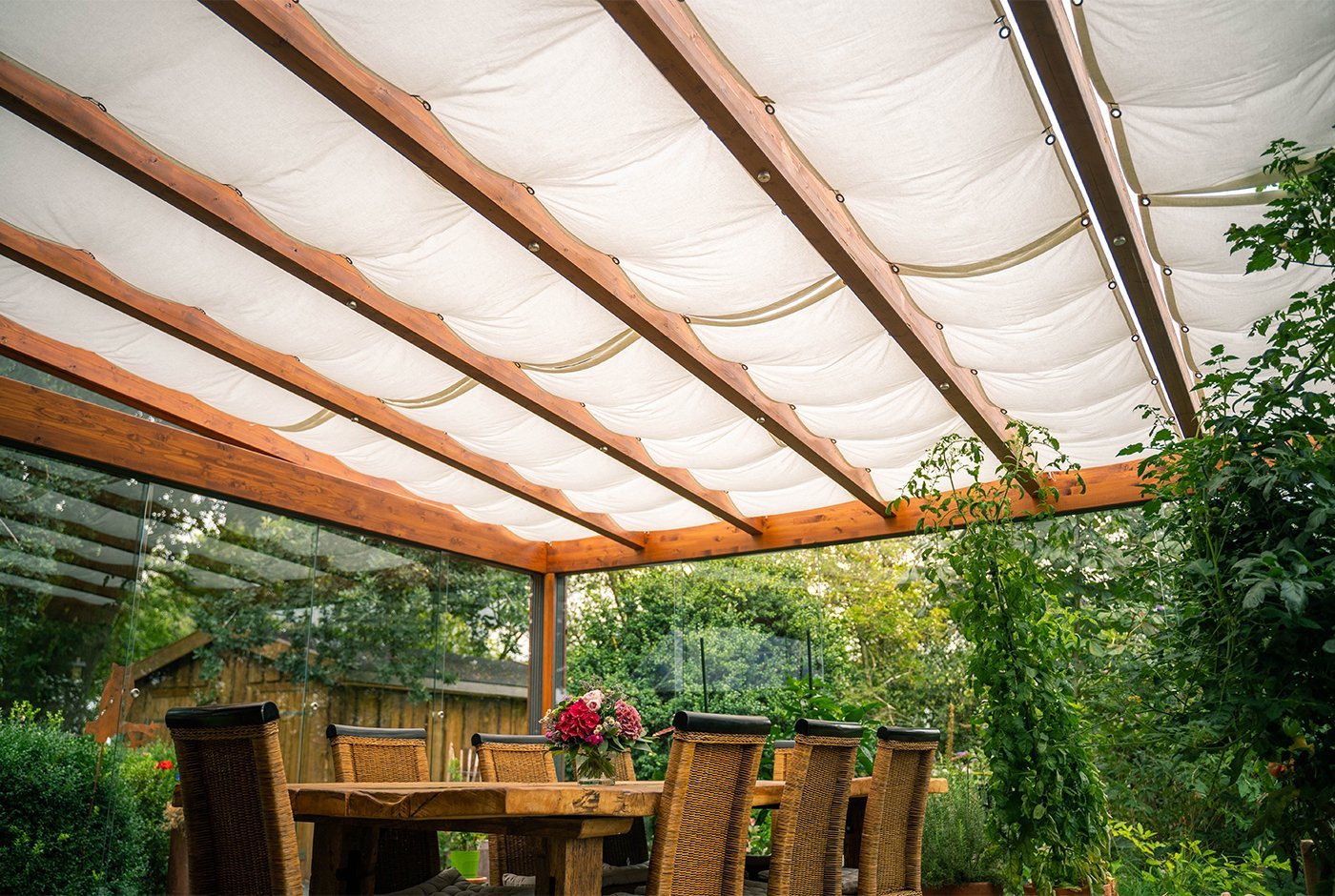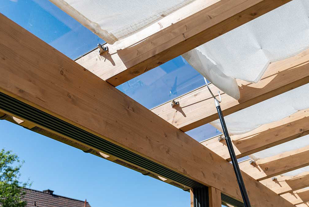 Een alternatief voor het elektrische zonnescherm is het handbediende touwspanscherm. Het voordeel is de flexibiliteit, want onze warmtevaste lattendoeken zijn veld voor veld aan te passen, afhankelijk van de stand van de zon en de wensen.