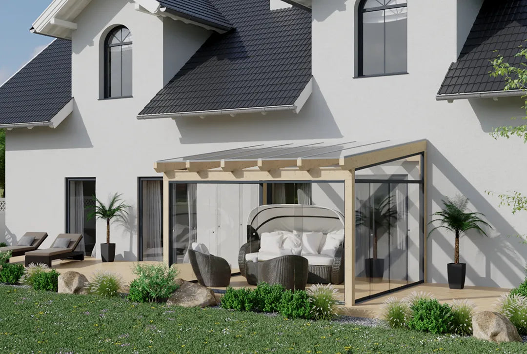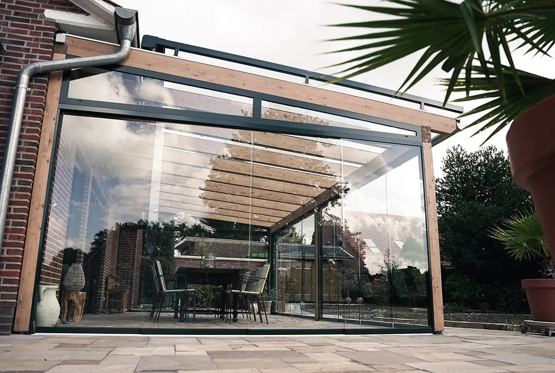 De koude wintertuin van hout in de kleur naturel met de afmetingen 400 x 400 cm is gebaseerd op een hoogwaardige houten constructie, die met een stabiel steeksysteem met zwaluwstaartverbindingen wordt samengevoegd. Zo weet u zeker dat uw koude wintertuin bijzonder stabiel en duurzaam is. De constructie wordt aangevuld met glazen schuifwanden, die niet alleen een betrouwbare bescherming bieden tegen weer en wind, maar ook een veelzijdige ruimte creëren. Dit betekent dat u 's avonds, wanneer de zon ondergaat, buiten kunt zitten en kunt ontspannen, of overdag uw thuiskantoor naar buiten kunt verplaatsen en toch in alle rust kunt werken. De hoogwaardige gelaagde veiligheidsglaspanelen bieden extra veiligheid en laten veel licht door, waardoor een lichte en vriendelijke sfeer ontstaat.