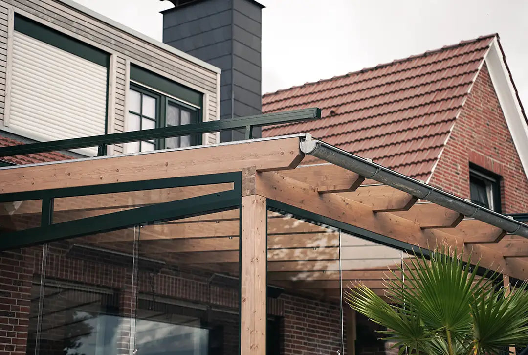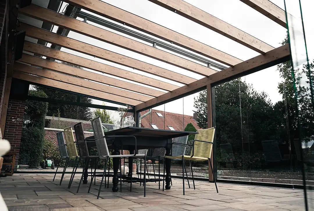 Onze koude wintertuinen van hout zijn zo ontworpen dat u het dak met palen aan de muur bevestigt. Hierdoor hoeft u de muurgording van het driehoekige raam niet uit te zagen en haalt u maximale esthetiek uit uw nieuwe buitenwoonkamer.
