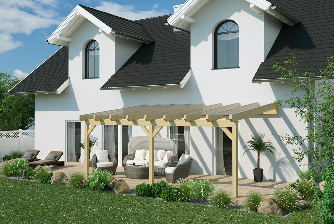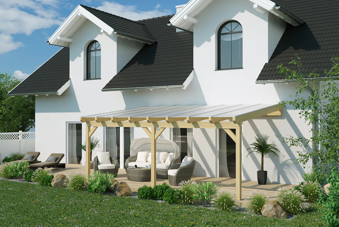 De houten terrasoverkapping in grafietgrijs met de afmetingen 6 x 4 m combineert natuurlijke esthetiek met moderne functionaliteit. Dit dak biedt niet alleen betrouwbare bescherming tegen weersinvloeden, maar past ook harmonieus in elke tuin of buitenruimte. De hoogwaardige gelaagde veiligheidsglaspanelen bieden extra veiligheid en laten veel licht door, waardoor een lichte en vriendelijke sfeer ontstaat.